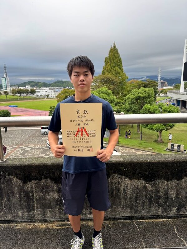 部活動 2025年09月30日 【陸上競技部】県新人戦(やり投5位 東海大会出場) 9月20日(土)、21日(日)に草薙陸上競技場で行われました県高校新人大会の結果をお知らせします。 三橋智成(25HR) やり投 49m45(5位)、円盤投26m66(24位)山内諒(24HR)砲丸投 10m01(19位) 萩原陽向(25HR) ハンマー投 32m24(18位)以上の結果により、三橋智成さんが10月25(土)、26日(日)に草薙陸上競技場で行われる東海大会に出場することになりました。応援を宜しくお願いします。