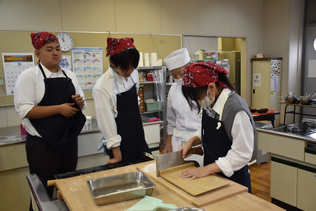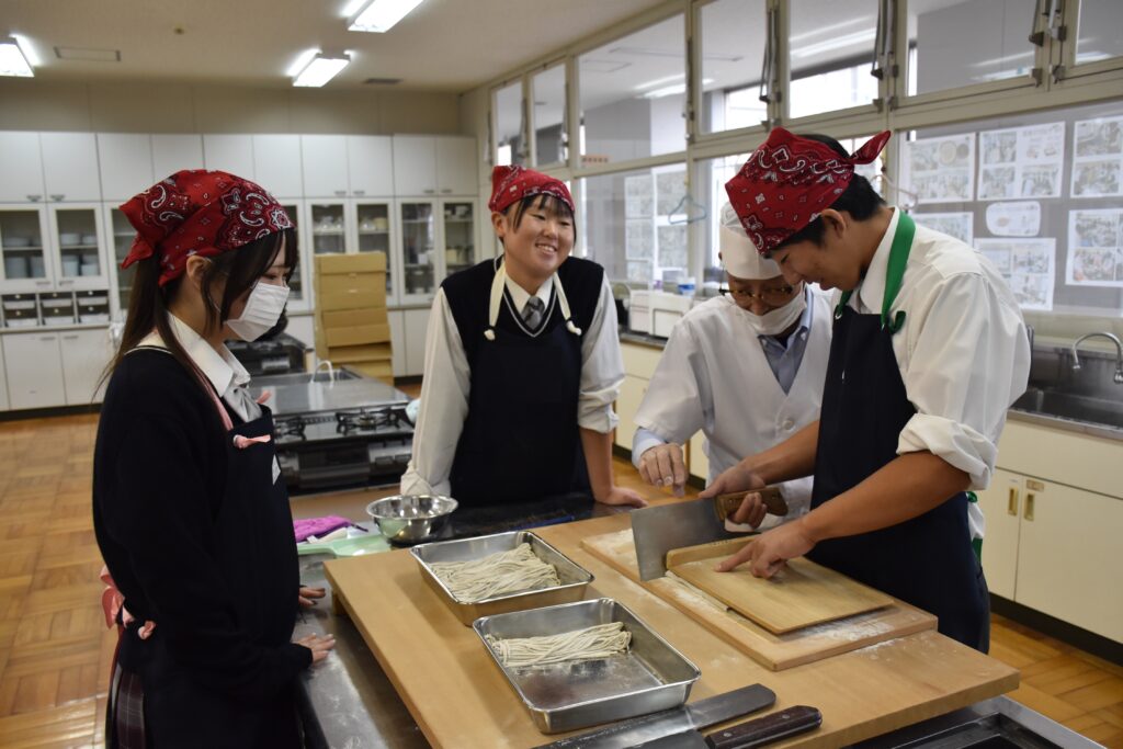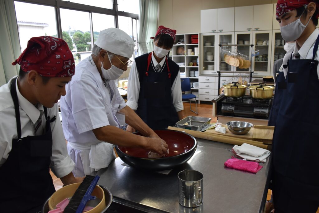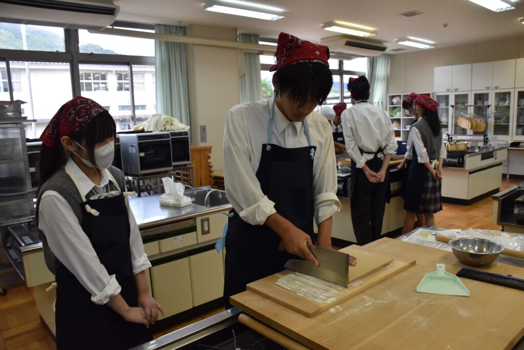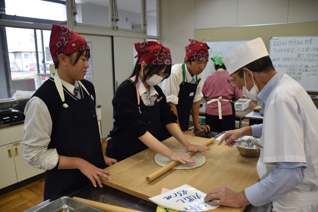 学校生活 2025年10月24日 【学校生活】家庭科~特色ある授業「そば打ち実習」(21HR) 文理探究科の21HRの「そば打ち実習」を紹介します。講師は静岡そば打ち同好会のみなさまです。菊練り→へそ出し→地のし→丸だし→四つだし→本のし→切る→茹でる→洗う→盛るなどの技術を1つ1つ実演していただきながら、生徒たちは真似て講師の技術の近づこうと頑張っていました。まさしく「学ぶ」の語源である「真似ぶ」の姿が調理室中で見られましたどうもありがとうございました。