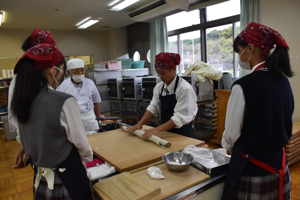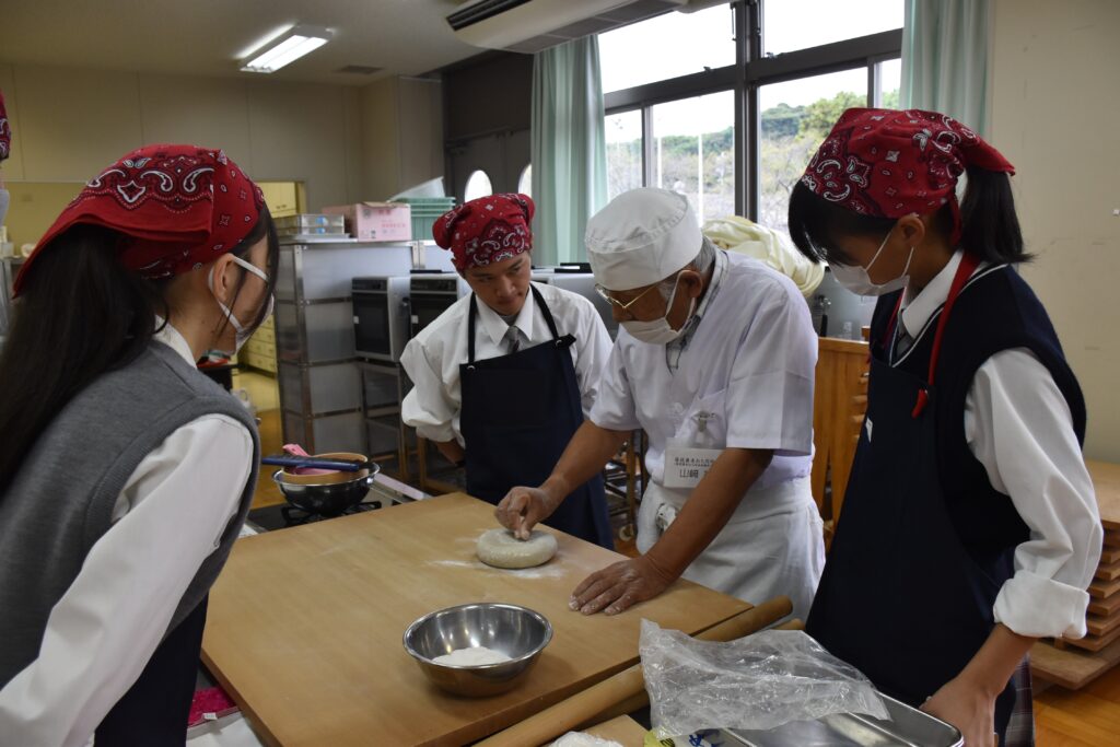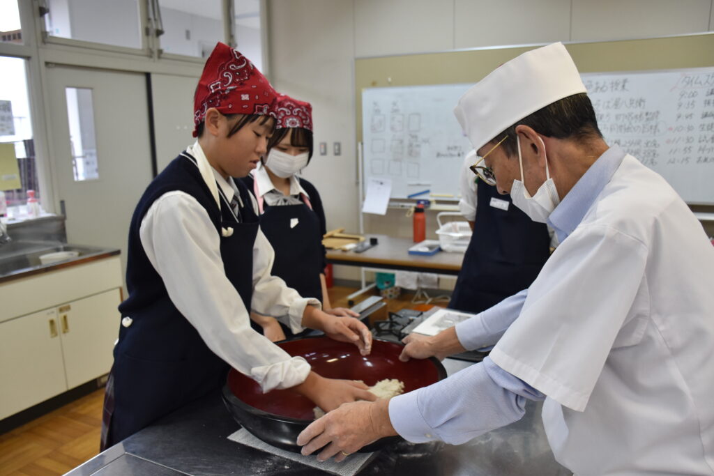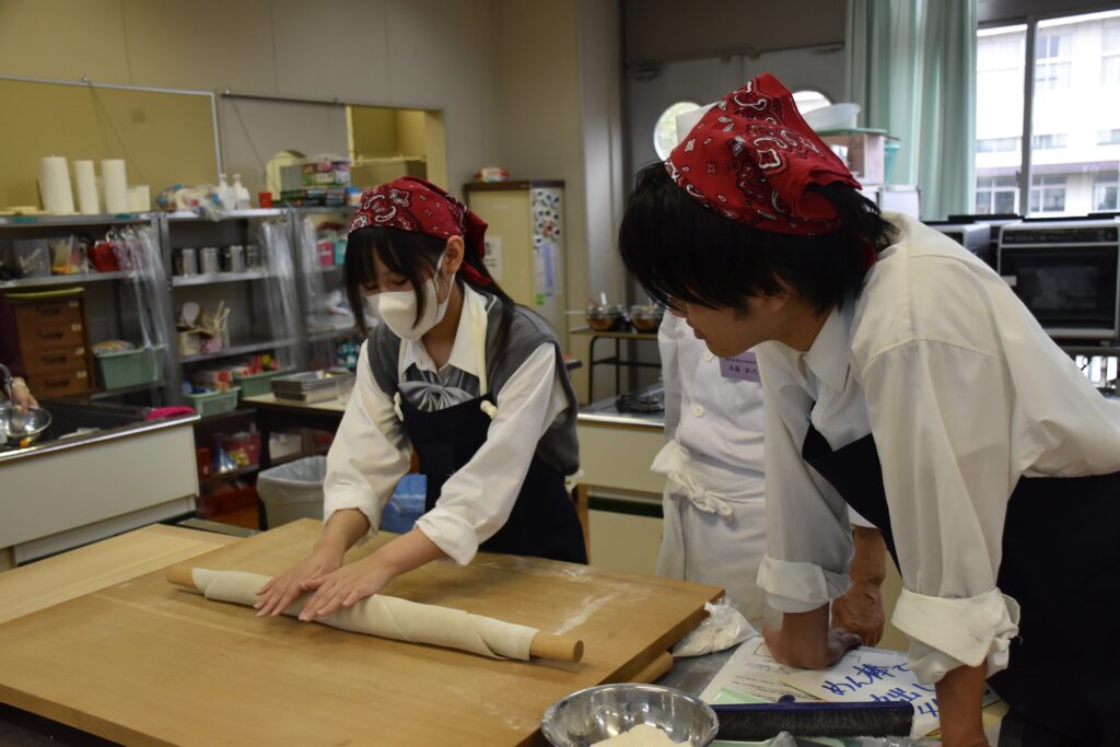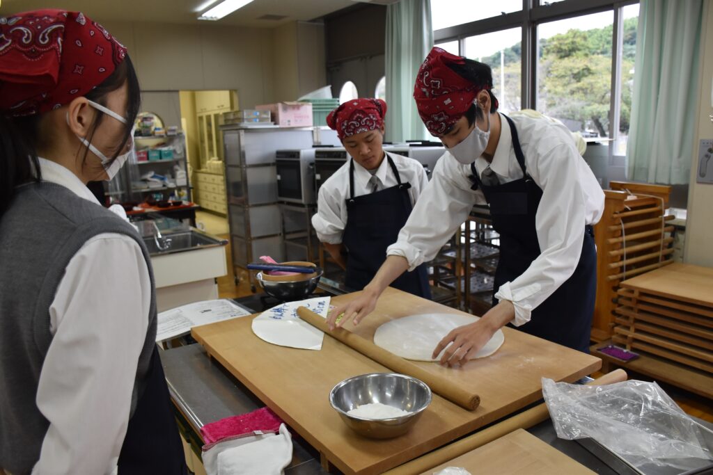 学校生活 2025年10月24日 【学校生活】家庭科~特色ある授業「そば打ち実習」(21HR) 文理探究科の21HRの「そば打ち実習」を紹介します。講師は静岡そば打ち同好会のみなさまです。菊練り→へそ出し→地のし→丸だし→四つだし→本のし→切る→茹でる→洗う→盛るなどの技術を1つ1つ実演していただきながら、生徒たちは真似て講師の技術の近づこうと頑張っていました。まさしく「学ぶ」の語源である「真似ぶ」の姿が調理室中で見られましたどうもありがとうございました。