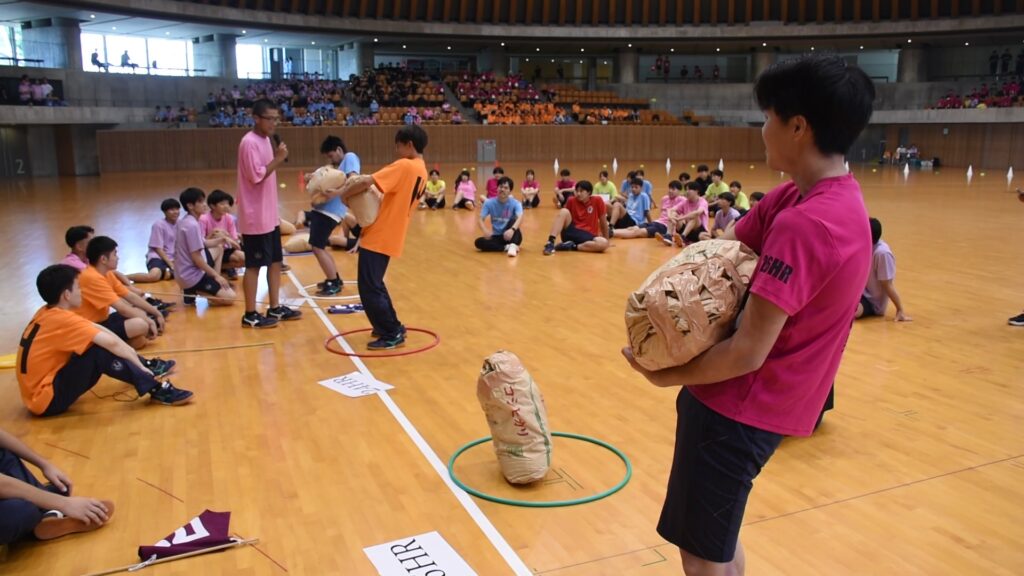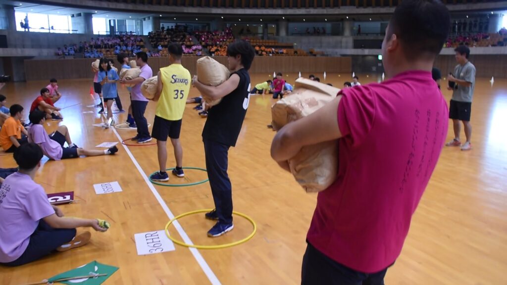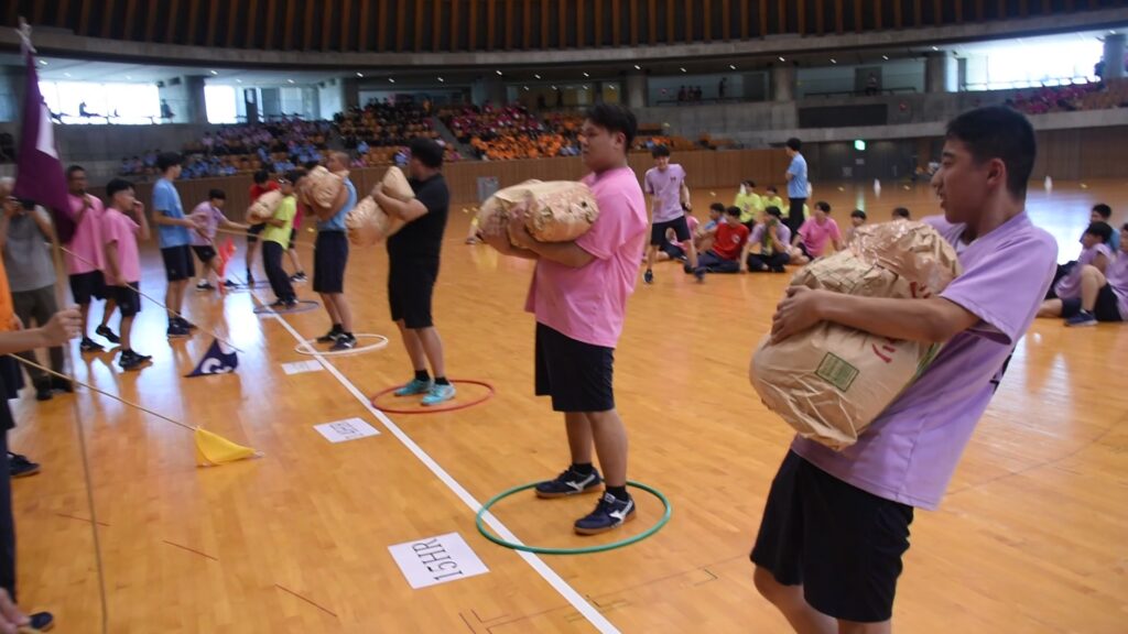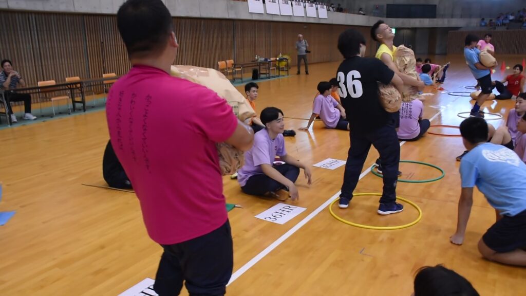 小さなサークル内で俵を抱え上げて、我慢比べをしました。