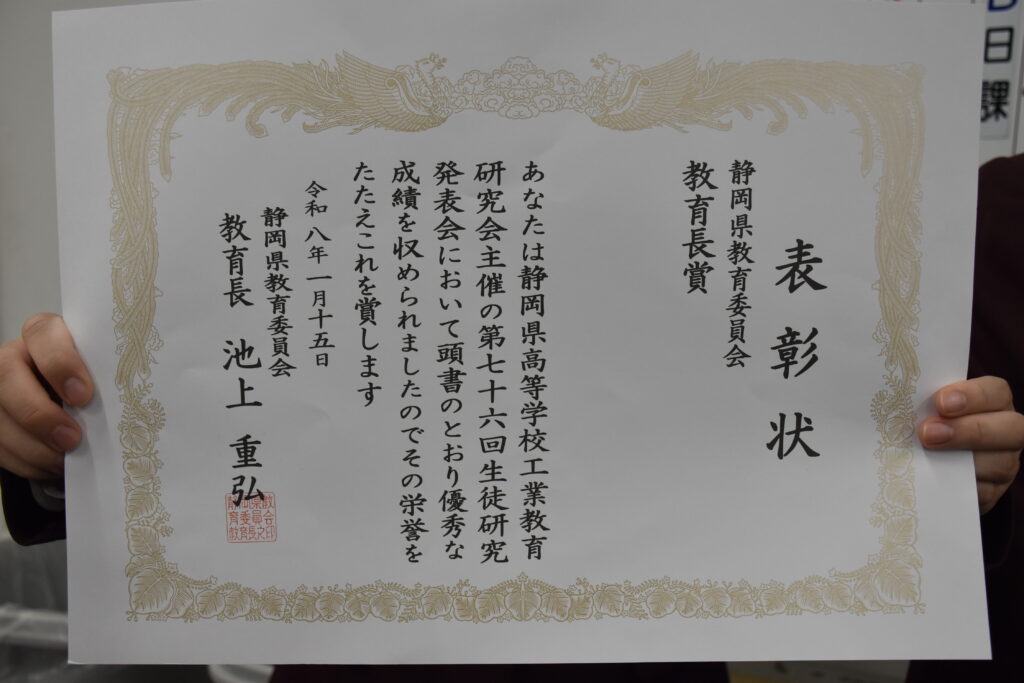「静岡県教育委員会 教育長賞」「静岡県工業高等学校長会 会長賞(最優秀賞)」「静岡県工業教育研究会 特別賞」の3賞を受賞する本校初の快挙を成し遂げました。